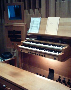 Etwas vom Hauptwerk, Schwellwerk und Spieltisch der Christian-Lobback-Orgel Baujahr 1990, 29 klingende Register, elektrische Registertraktur, mechanische Spieltraktur, 16 elektronische Setzer. Hier gehts zur Disposition als pdf-Datei.